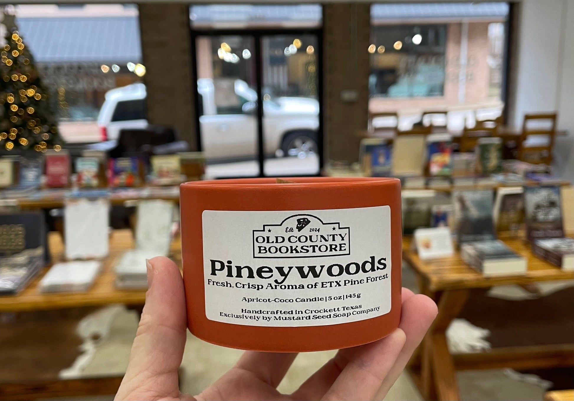 Locally made in Crockett candle collaboration between Crazy Four Books & Coffee and Mustard Seed Soap Co.